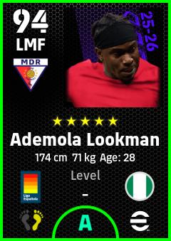 . Ademola Lookman is a Left Midfielder footballer from Nigeria who plays for Madrid Rosas Rb in eFootball 2026.
