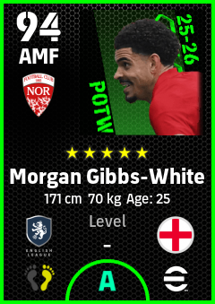 . Morgan Gibbs-White is a Attacking Midfielder footballer from England who plays for Nottingham Rw in eFootball 2026.