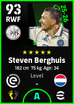 . Steven Berghuis is a Right Wing Forward footballer from Netherlands who plays for Ajax in eFootball 2026.