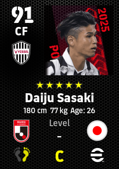 . Daiju Sasaki is a Center Forward footballer from Japan who plays for Vissel Kobe in eFootball 2026.