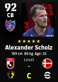. Alexander Scholz is a Center Back footballer from Denmark who plays for Fc Tokyo in eFootball 2026.