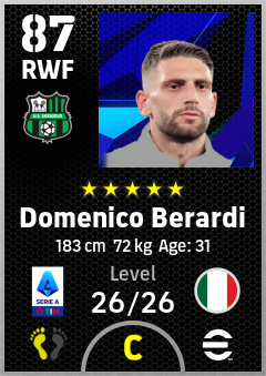 . Domenico Berardi is a Right Wing Forward footballer from Italy who plays for Sassuolo Nv in eFootball 2026.