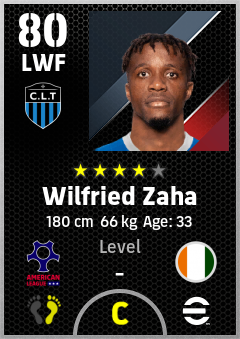 . Wilfried Zaha is a Left Wing Forward footballer from Côte D'ivoire who plays for Charlotte Bbgw in eFootball 2026.