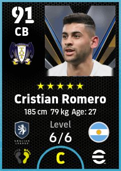 .Cristian Romero is a Center Back footballer from Argentina who plays for Tottenham Wb in eFootball 2026.