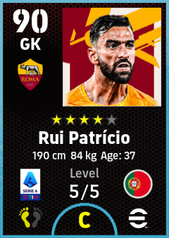 . Rui Patrício is a Goalkeeper footballer from Portugal who plays for Roma Gr in eFootball 2026.