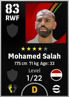 . Mohamed Salah is a Right Wing Forward footballer from Egypt who plays for Free in eFootball 2026.