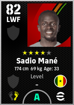 . Sadio Mané is a Left Wing Forward footballer from Senegal who plays for Free in eFootball 2026.
