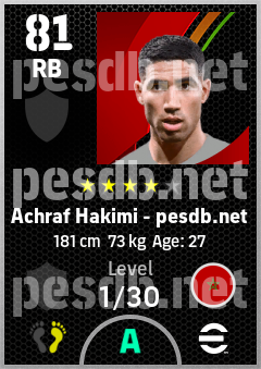 . Achraf Hakimi is a Right Back footballer from Morocco who plays for Free in eFootball 2026.
