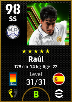 .Raúl is a Second Striker footballer from Spain who plays for Madrid Chamartin B in eFootball 2026.
