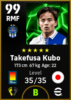.Takefusa Kubo is a Right Midfielder footballer from Japan who plays for Vasco Gipuzkoa Ab in eFootball 2026.