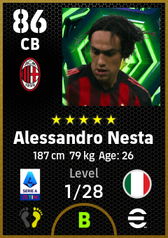 . Alessandro Nesta is a Center Back footballer from Italy who plays for Ac Milan in eFootball 2026.