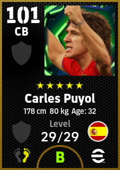 . Carles Puyol is a Center Back footballer from Spain who plays for Free in eFootball 2026.