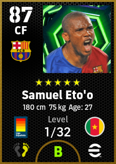. Samuel Eto'o is a Center Forward footballer from Cameroon who plays for Fc Barcelona in eFootball 2026.